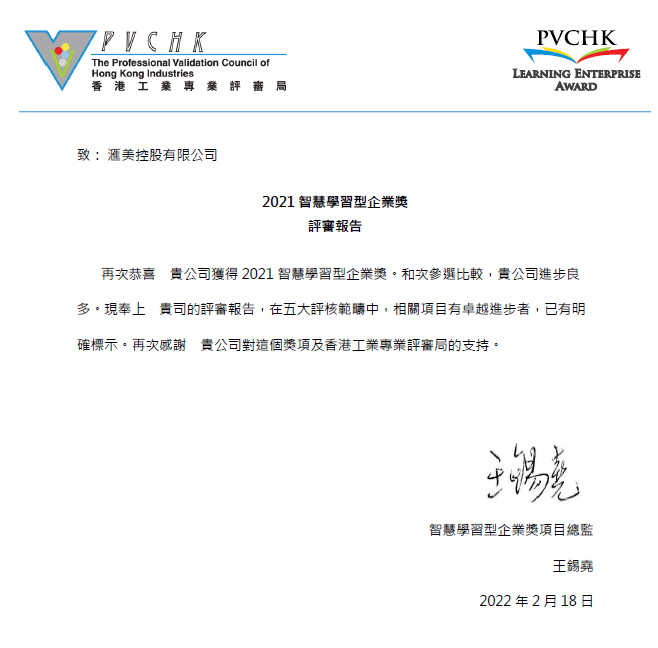 由香港工业专业评审局举办的“2021智慧学习型企业奖”的获奖结果已经出炉,今年共有34家企业成功通过复审,最终摘得“2021智慧学习型企业奖”的桂冠。其中,我公司汇美控股就在此获奖名单中,而且这也是汇美控股连续两次获此殊荣了。