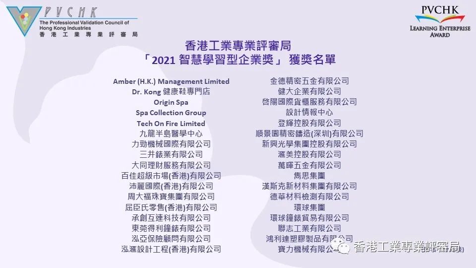 2015年,香港工业专业评审局创立了“智慧学习型企业奖”,奖项每两年颁授一次,今年是第四届评审。智慧学习型企业奖,旨在表扬那些在推动学习文化中,建立学习体系,有效转化并取得优良成果的企业。